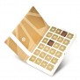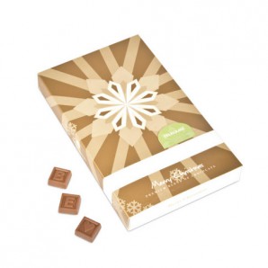 Adwentowy kalendarz w postaci czekoladowego telegramu. W 24 okienkach ukryte zostały kostki z literkami wykonane z czekolady mlecznej, belgijskiej. Literki tworzą tekst życzeń: Zdrowych Wesołych Świąt.