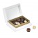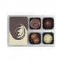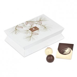 W białym kartoniku z oryginalną grafiką nawiązującą do świąt Bożego Narodzenia zamknęliśmy słodkie przysmaki. Niezwykle dekoracyjną tabliczkę powstałą z połączenia czekolady deserowej i białej, 3 wyśmienite pralinki i nietuzinkowe przekąski.